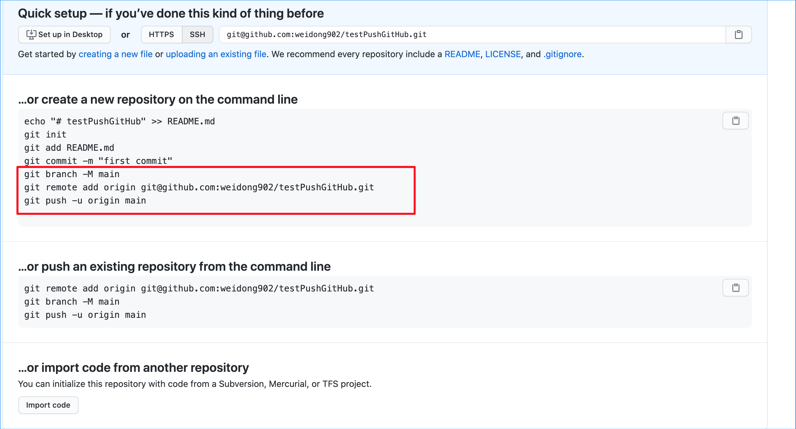 mkdir testPushGitHub cd testPushGitHub # 单行注释(shell脚本) # 将本文件夹变成Git可管理的仓库 git init git init git add . #将文件夹目录下所有提交到缓存区,也可(git add xx.txt) git status # 查看现有状态 git commit -m "写些注释,不写注释提交不了" #将文件提交到本地仓库 #连接远程仓库:Git仓库与GitHub仓库之间传输是通过ssh加密的,所以初次需要设置下。 # mac下 cd ~/.ssh #(如果没有创建 mkdir ~/.ssh) ssh-keygen -t rsa -C "youremail@example.com" #一路回车 cat ~/.ssh/id_rsa.pub # github -->settings-->SSH and GPG keys-->NEW SSH key 将本地电脑中id_rsa.pub复制到 # 创建远程仓库 # 如果之前电脑 git branch -M main git remote add origin git@github.com:weidong902/testPushGitHub.git git push -u origin main```